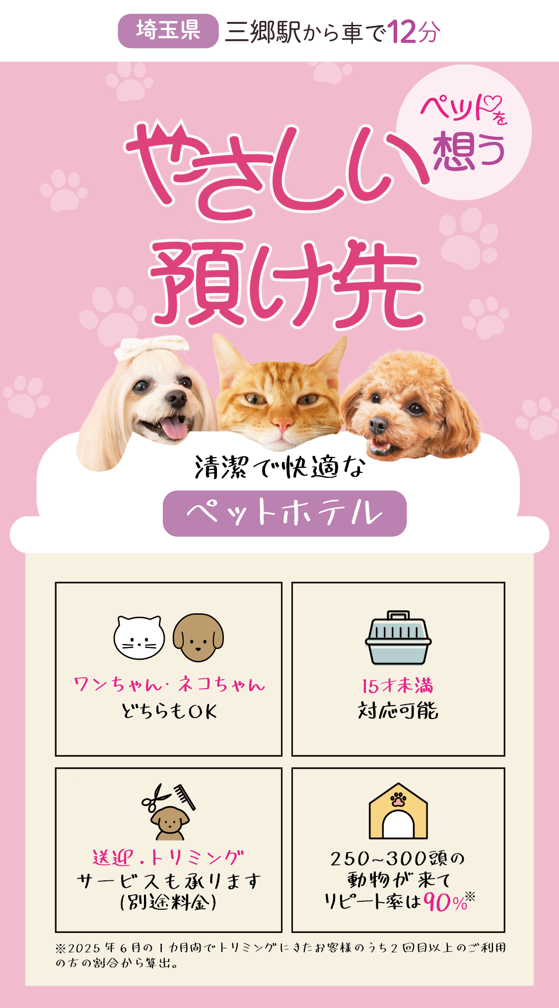 トリマー歴15年以上の代表、9年の店長をはじめ、3年以上の経験豊富なスタッフが在籍。一頭ごとの性格や体調に合わせ、細やかに対応いたします。歯磨きのみのご利用も承っており、シニアのワンちゃん・ネコちゃんもお預かり可能です。スタッフ全員がペットファーストの精神で、大切にお世話いたします。